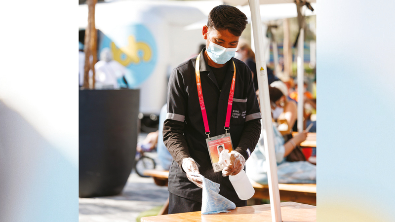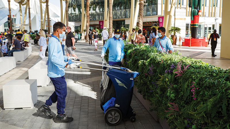 مثل خلية نحل، جنود «إكسبو 2020 دبي» يعملون بهمّة لا تهدأ في كل ركن، من أجل راحة وسلامة زوار المعرض، ينظّفون ساحة هنا، ويعقّمون بقعةً هناك، ويطمئنون على أن كل شيء في مكانه، وبأفضل صورة، كي يستمتع ضيوف الحدث العالمي برحلتهم المتفرّدة بأمان، ويسجلوا ذكريات لا تنسى خلال جولتهم بين الأجنحة والردهات والممرات التي لا تشبه سواها، فثمة درب يفضي إلى «الإمارات»، وطريق آخر يوصل إلى دولة في جهات العالم المختلفة.. لتتواصل الرحلة بين أكثر من 192 بلداً في «أرض إكسبو» التي تراهن على منح الجميع أملاً في مستقبل أكثر إشراقاً وجمالاً.