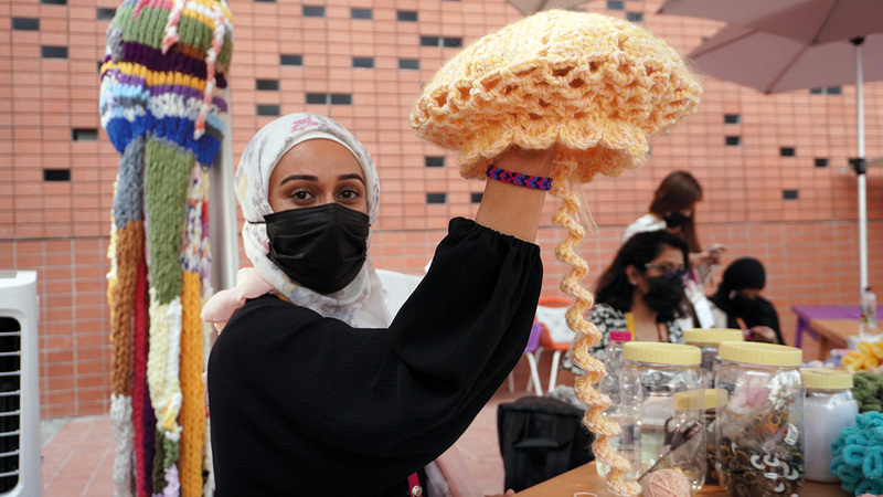 وينظم «البيت» ورشاً في الهواء الطلق تجتذب ضيوف المعرض الدولي من الكبار والصغار، لكي يشكلوا بخيوط الكروشيه الناعمة نجمة بحر، أو فرساً، أو حتى أخطبوطاً، تنضم إلى المعروضات، وتتعاون معها في تكبير حجم الرسالة التوعوية بشكل مختلف.