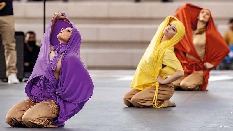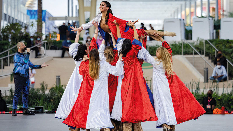 واحتشد مئات الزوار في محيط وداخل ساحة الوصل، القلب النابض لـ«إكسبو 2020 دبي»، لمشاهدة العروض الفنية والاستعراضية الراقصة للفرقة المشاركة، وسط موجات من التصفيق الحار للأداء الراقي والمتميز الذي قدمه أعضاء الفرقة الغنائية والاستعراضية.