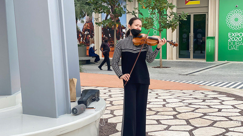 يومياً، تتجوّل الفنانة ناتالي، في أرجاء «إكسبو 2020 دبي»، مطلقة العنان للآلة التي تحتضنها وتعشقها، لتقدم على الكمان مقطوعات موسيقية تشبه روح المعرض العالمي، إذ تتنوّع المعزوفات التي تؤديها الفنانة الروسية، لتجتذب أنظار كثيرين يجدون في أنغامها فرصة للاستماع بالأنغام الراقية.