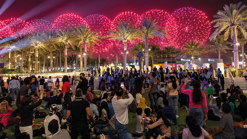 أضاءت الألعاب النارية سماء «إكسبو 2020 دبي»، الليلة قبل الماضية، لتمتع آلاف الحضور عند منصّة اليوبيل، وفي مختلف أرجاء موقع الحدث الدولي، في مشهد مبهر خلب أسعد الزوّار الذين تعلقت أعينهم بالسماء لدقائق عدة.