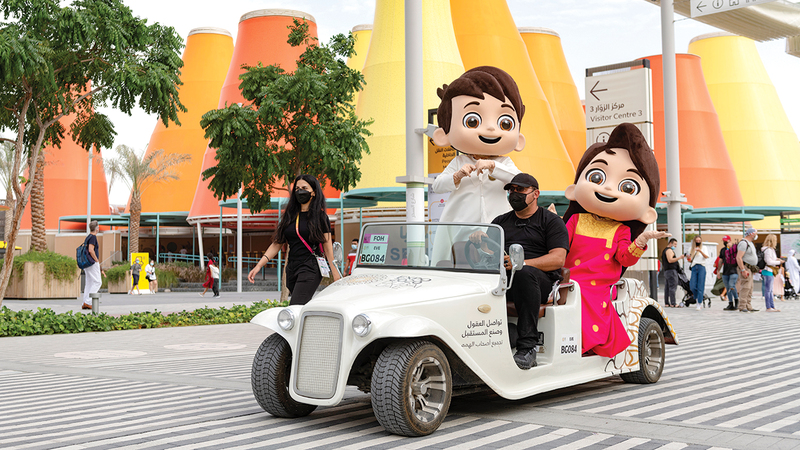 في ساحة البحر بمنطقة التنقل، يرحب كل من شخصيتَي «راشد» و«لطيفة» الذكيتين والمحبوبتين بضيوف المعرض الدولي، لينشرا البهجة بين الصغار والكبار.