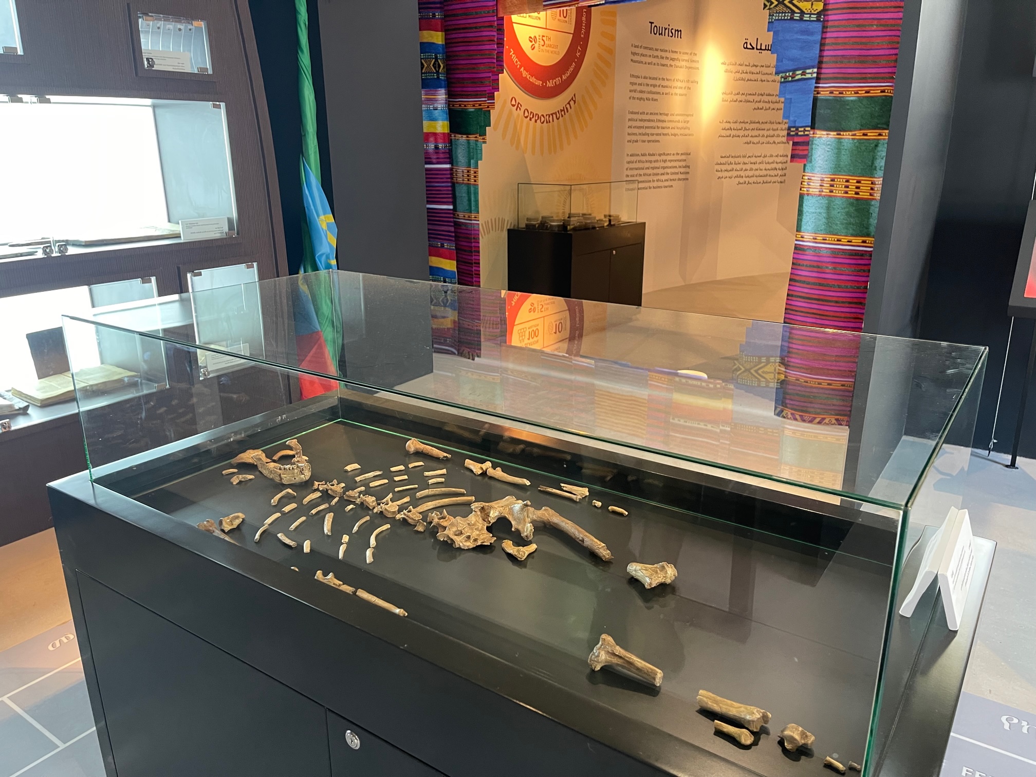 زيارة جناح أثيوبيا في منطقة الفرص، تقدم واحدة من التجارب المثيرة في إكسبو 2020 دبي، مكان عامر بالكنوز التاريخية والأثرية النادرة، التي تروي قصص الأرض والشعب، ولعل أهم تجربة يمكن أن ثير فضول زوار هذا الجناح، رؤية أحد أقدم أسلافنا البشريين، ألا وهي أحفورة لوسي شبيهة البشر، المحفوظًة في خزنة بلورية مشيدة خصيصًا لحمايتها.