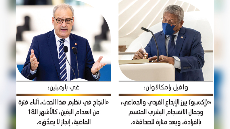 من جانبه، أكد رئيس جمهورية سيشل، وافيل رامكالاوان، أن «(إكسبو 2020) يمثل منارة للتفاؤل العالمي، ولنمو عالمي مسؤول ومستدام، ولشعوب العالم التي تقف معاً ضد الشدائد، وللإبداع الفردي والجماعي، ولجمال الانسجام البشري المتسم بالفرادة، والأهم من ذلك، منارة للصداقة، والتواصل، والاعتراف بأننا، عندما يتعلق الأمر بصنع مستقبل صحي لكوكب الأرض، نتكاتف جميعاً لتحقيق ذلك، من أكبر دولة إلى أصغرها».