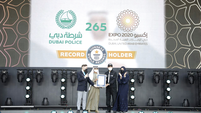وتسلمت القيادة العامة لشرطة دبي و«إكسبو دبي» شهادة «غينيس» رسمياً، بحضور وزيرة دولة لشؤون التعاون الدولي المدير العام لمكتب «إكسبو 2020 دبي»، ريم بنت إبراهيم الهاشمي، ومساعد القائد العام لشرطة دبي لشؤون الإدارة اللواء أحمد محمد رفيع، ومدير الإدارة العامة للموارد البشرية العميد صالح مراد، وعدد من الضباط ومسؤولي أجنحة الدول المشاركة في الحدث العالمي.