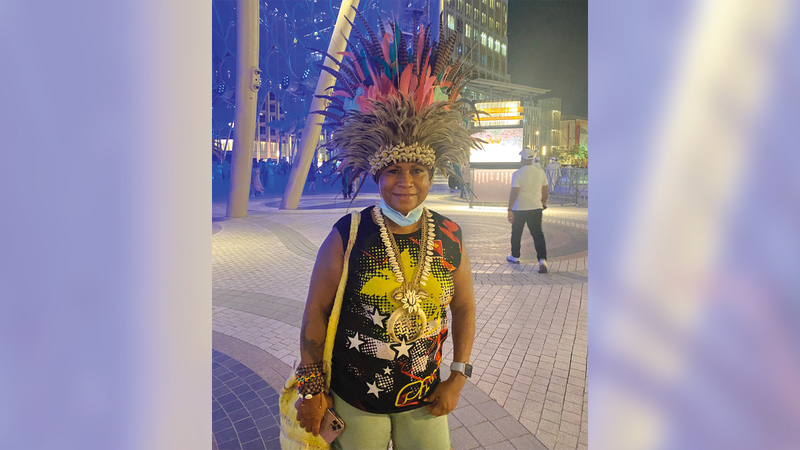 اختارت الأسترالية، روز سويت أبل، أن تزور «إكسبو 2020 دبي» متشحة بإكسسوارات ترمز إلى بلدها الأصلي (غينيا الجديدة)، إذ زيّنت رأسها بما يشبه قبعات الهنود الحمر المصنوعة من الريش الملون، والمزركشة بمجموعة من أصداف البحر، لتحمل إلى المحفل العالمي ملامح هوية بلدها البعيد، وهي تتجول بين أجنحة الدول التي يصل عددها إلى 192.