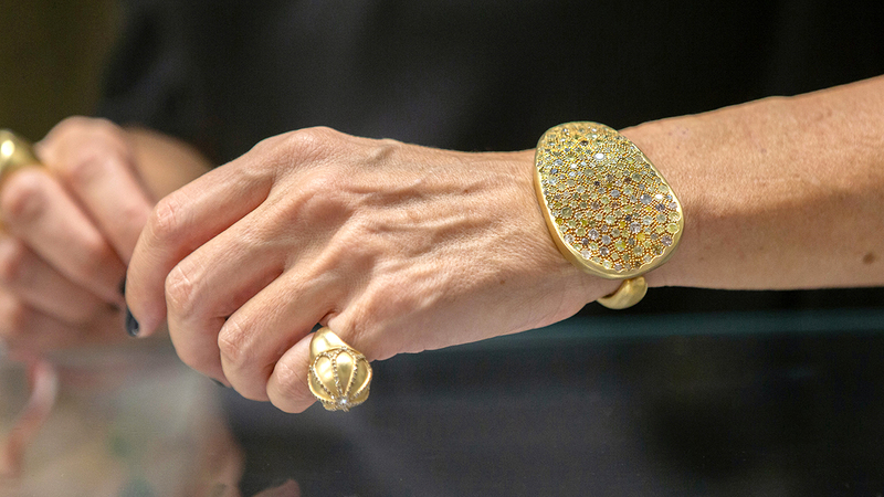 وقالت: «إنها تعتمد تصميم الذهب غير الملمع بالفرشاة على نحو تام»، مضيفة أن «بين معروضاتها مجموعة من القطع تشبه في تصميمها القطعة التي استوحي منها شعار (إكسبو 2020 دبي)»، لافتة أنها تمثل لها مصدر إلهام.