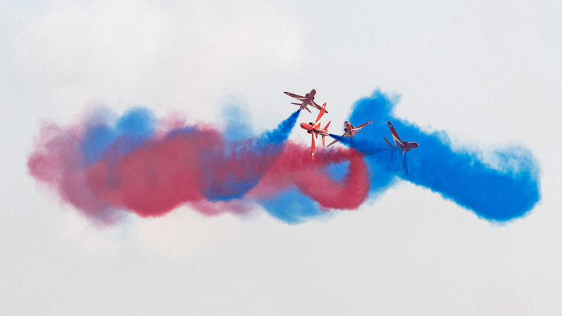 وتمكّن الزوار من رؤية طائرات «هوك» السريعة لفريق «السهام الحمر»، المعروفة بالطيران على طريقة أسراب الطيور، وبعروض خطوط الدخان المتزامنة العامرة بالألوان، فوق حديقة اليوبيل، وذلك في إطار مشاركة جناح المملكة المتحدة في «إكسبو 2020 دبي». ويمثل فريق «السهام الحمر»، بصفته واحداً من فرق الاستعراض الجوي الرائدة في العالم، الواجهة العامة لسلاح الجو الملكي، ويساعد القوات المسلحة البريطانية في عملية التوظيف، إذ يعمل سفيراً عبر تقديم استعراضات داخل المملكة المتحدة وخارجها. وأبهر فريق «السهام الحُمر» العالم منذ عام 1965 بتشكيلته المميزة «الماسة 9»، وطيرانه المُتقَن، وقد أدى نحو 5000 استعراض جوي في 57 دولة. ويقع جناح المملكة المتحدة في منطقة الفرص، وهو مستوحى من مشروع «رسالة اختراقية»، واحد من المشروعات الأخيرة للعالم الراحل ستيفن هوكينغ. ويسلّط الجناح الضوء على الخبرات البريطانية الرائدة في قطاعات متعددة، تشمل الذكاء الاصطناعي والفضاء، تحت شعار «الابتكار من أجل مستقبل مشترك».