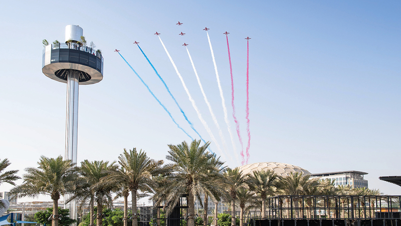 حلّق الفريق الجريء، الشهير بـ«السهام الحمر»، فريق سلاح الجو الملكي البريطاني للاستعراض الجوي، فوق موقع «إكسبو 2020 دبي»، أمس.