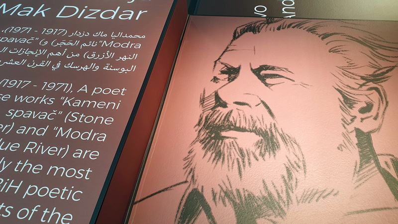 وربما يجدر التوقف عند ديزدار لأن اسمه ارتبط بنوع من النقوش الصخرية التي تحتل أهمية خاصة في ثقافة أهل البوسنة والهرسك. ويعرض الجناح نماذج صغيرة الحجم لتلك النقوش المعروفة باسم«stećci» (ستيتشي)، التي أولاها ديزدار أهمية كبيرة في كتاباته النثرية وأشعاره.