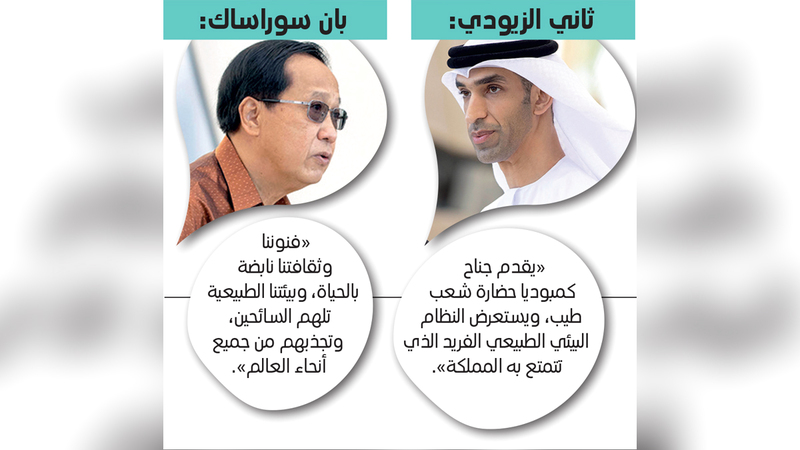 وقال الزيودي: إن «جناح كمبوديا يدمج ما بين الثقافات القديمة والتنمية المستدامة، إذ يقدم تاريخ هذا الشعب الطيب وحضارته، فيما يستعرض في الوقت نفسه النظام البيئي الطبيعي الفريد الذي تتمتع به البلاد، وتطورها الزراعي».
