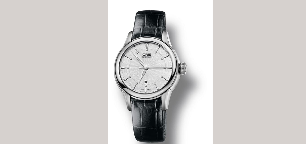 تتألق ساعة Artelier Date Diamonds من أوريس بـ 12 ألماسة تم اختيار كل حجر فيها لضمان البريق الفاتن بتشطيب ضفيري فضي مذهل .