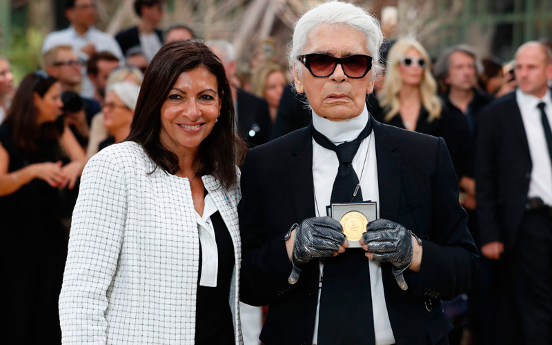 وتهادت عارضات لاجرفيلد في السابق بأزيائه في أماكن غير تقليدية مثل صالة مغادرة أحد المطارات وسوبر ماركت ومطعم مزدحم لكنه هذه المرة فضل العودة إلى الأجواء التقليدية وأقام ممشى العرض في قاعة جراد باليه تحت مجسم البرج الشهير.