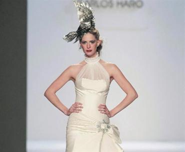 عارضة ترتدي فستان زفاف أبيض من إبداع المصمم الإسباني كارلوس هارو خلال عرض للأزياء أقيم أول من أمس في مدريد.