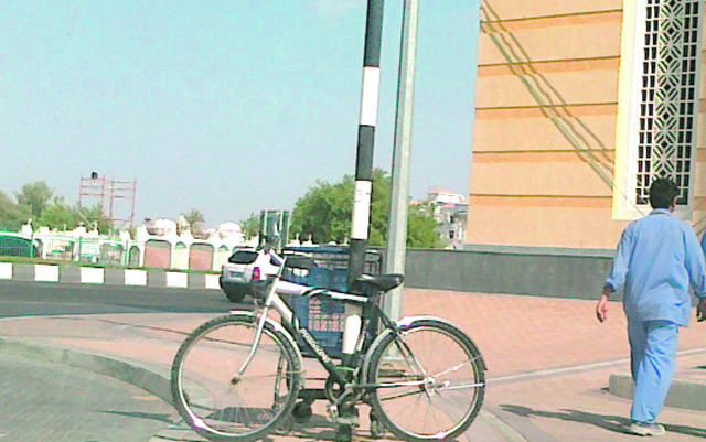 أصبح من النادر ألا ترى دراجة مقيدة إلى عمود إنارة في بعض المناطق، كأن أعمدة الإنارة مخصصة لهذه الغاية تحديداً.