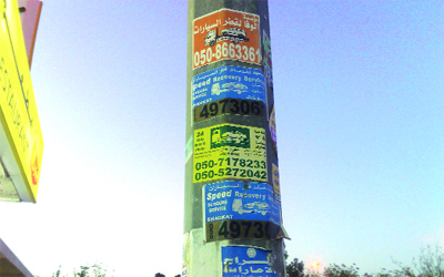 اعتادت بعض شركات قطر السيارات لصق إعلاناتها الورقية على أعمدة الإنارة في الشوارع، في مناطق عدة في الدولة ما يشوّه المظهر الحضاري، ولذا يتعين على الجهات المختصة مخالفة هؤلاء المعلنين لمنعهم من تكرار هذه التصرّفات مستقبلاً، حفاظاً على المنظر العام للشوارع.