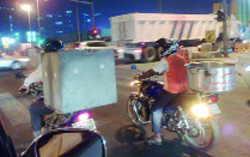 وضع سائق دراجة نارية في أبوظبي حمولة مخالفة على الكرسي الخلفي، ما يعرضها للسقوط أثناء سيرها، ويعرض حياته وحياة السائقين والمارة في الشارع للخطر، وهذا المنظر غير حضاري، ويتعين على الجهات الرقابية فرض غرامات على المخالفينً.