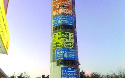 باتت الملصقات الإعلانية من أكثر الظواهر السلبية انتشاراً في أماكن متفرقة من الدولة، خصوصاً الملصقات عن قطر السيارات على الطرقات الخارجية، ويستغل أصحاب هذه الملصقات أي مساحة خالية للصق إعلاناتهم بصورة غير قانونية، حتى إن أعمدة الإنارة لم تسلم من هذه الملصقات، ومجمعات الكهرباء ومكبات النفايات باتت لوحات إعلانية، لذا أرجو من الجهات المعنية وضع الحلول المناسبة لهذه الظاهرة.