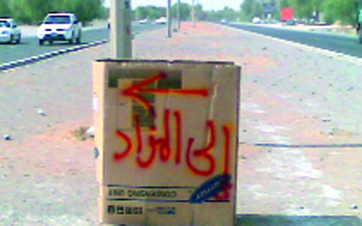 وضع أحد الأشخاص لافتة إرشادية من الكرتون في شارع المطار في رأس الخيمة، أسفل عمود إنارة كتب عليها، إلى المزاد، ما يشوّه المنظر العام للمكان، لذا أتمنى من الجهات المعنية إزالة هذا الصندوق الكرتوني، وفرض غرامات على الشخص الذي وضعه، في حال تحديد شخصيته لمنعه من تكرار ذلك مستقبلاً.