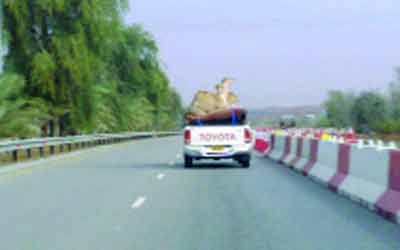 وضع سائق عدداً من الإبل في صندوق سيارته الخلفي، ما يعرضها للانقلاب وتالياً سقوط الحمولة على الطريق، ولذا يتعين على الجهات الرقابية مخالفة قائدي مثل هذه السيارات لمنعهم من تكرار ذلك مستقبلاً.