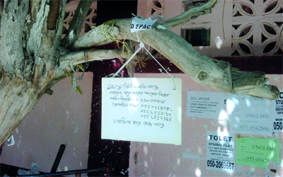 تحوّلت شجرة في دبي إلى لوحة إعلانية عشوائية، وعندما كلت من حمل الإعلانات، اتجه المعلنون العشوائيون إلى جدار خلف الشجرة، لوضع إعلانات بيع وتدريس مواد دراسية وتأجير شقق، بصورة تشوّه المكان، لذا يجب على الجهات المعنية تشديد عقوبة الإعلانات العشوائية، للحد من هذه الظاهرة السلبية.
