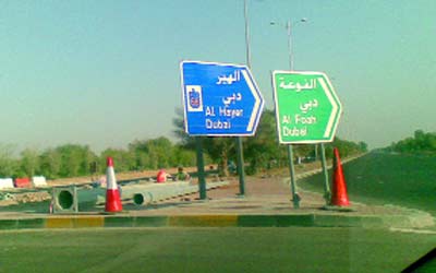 يلاحظ السائقون وجود لوحتين إرشاديتين على دوّار الخليف في العين، إحداهما تشير إلى منطقتي دبي والهير، والثانية تشير إلى دبي والفوعة.