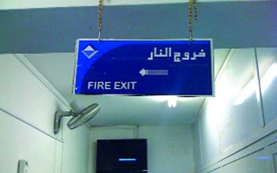 علق أحد المستشفيات لافتة إرشادية في أحد الممرات الداخلية، تقول «خروج النار»، ما يعني أن هذا الاتجاه هو مصدر خروج النار، والمفروض أن تُكتب «خروج طوارئ»، لتوجيه الأفراد إلى المكان الصحيح للهروب إلى الخارج في حالات الحرائق، لذا يجب على إدارة المستشفى أن تصحح لافتاتها حتى تؤدي الغرض منها.