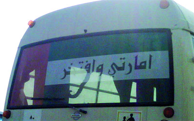 لم تسلم الشعارات الوطنية من الأخطاء اللغوية، وفي الصورة ألصق سائق ملصقا مكتوباً عليه «إمارتي وأفتخر»، بدلاً من أن تُكتب «إماراتي وأفتخر»، لذا يتعين أن تتكاتف الجهات المعنية في الدولة، للقضاء على ظاهرة الأخطاء اللغوية الشائعة، خصوصاً إذا كانت تمس شعاراً وطنياً.