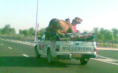 وضع سائق مركبة جملين في الصندوق الخلفي، على الرغم من صغر حجمه، وبالتالي إمكانية سقوطهما في أي لحظة، خصوصاً في حال توقف السيارة فجأة، ما يؤدي إلى وقوع حوادث على الطريق، لذا يتعين على الحهات المعنية مخالفة مثل هؤلاء السائقين، لمنعهم من تكرار ذلك مستقبلاً.