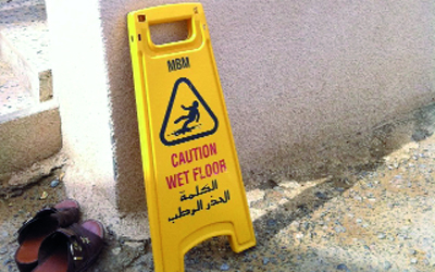 تستخدم شركات نظافة لافتات باللغة الإنجليزية، لتحذير الأفراد من وجود مياه على الأرض، لكنها عندما تحاول ترجمة هذه اللافتات التحذيرية إلى اللغة العربية، تقع في أخطاء لغوية عدة، ما يجعلها غير مفهومة ولا تؤدي الغرض الذي وُضعت من أجله، لذا يجب على الجهات المعنية التدقيق على اللافتات الإرشادية، حرصاً على لغتنا الجميلة.