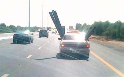 استهتر سائق بقواعد المرور، وزاد من حمولة المركبة التي يقودها على طريق الشارقة الذيد، بوضع عدد من المواسير بداخلها من خلال الباب، ما قد يؤدي إلى وقوع حوادث مرورية، لذا يتعين على الجهات المعنية مراقبة الطرق، وفرض غرامات على المخالفين لمنعهم من تكرار ذلك مستقبلاً.