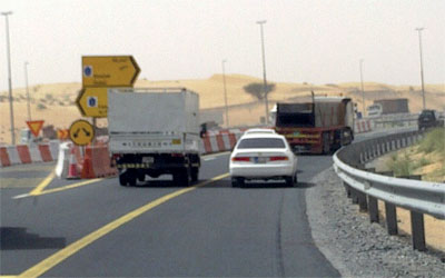 سائق سيارة صغيرة، يحاول اجتياز شاحنة تسير على مسافة قريبة منه، متخطيا هامش الطريق المخصص للإسعاف وسيارات الشرطة.