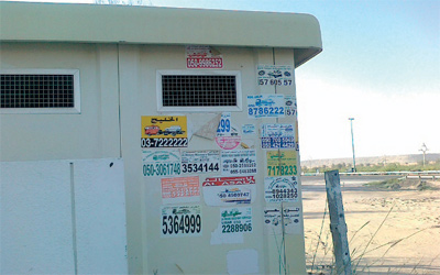 لصق أشخاص إعلانات عشوائياً فوق جدار مولدات كهرباء في محطة بترول الإمارات على طريق دبي ـ العين، ومعظمها تابع لشركات قطر سيارات، ما يؤدي إلى تشوه المنظر الحضاري للمكان، لذا أتمنى من الجهات المعنية اتخاذ إجراء حيال هذا الأمر، وفرض غرامات على أصحاب هذه الإعلانات.