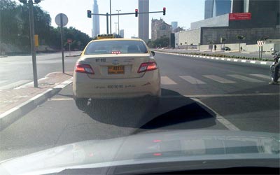 سائق سيارة أجرة في دبي، منعته سرعته الزائدة من التوقف في المكان الصحيح، إذ تحول لون الإشارة المرورية من الأصفر إلى الأحمر قبل أن يتمكن من اجتيازها.