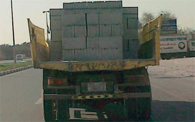 مركبة تحمل صفوفا من الطوب الإسمنتي في طريقها إلى أحد المشروعات الإنشائية. ويبدو واضحا أنها تفتقر إلى الحماية المعدنية، التي تمنع ـ في حال تعرضها لحادث مفاجئ ـ سقوط الطوب منها، والتسبب في إعاقة السير على الطريق، أو في وقوع حوادث أخرى، قد تكون أشدّ من الحادث الذي تعرضت هي له.