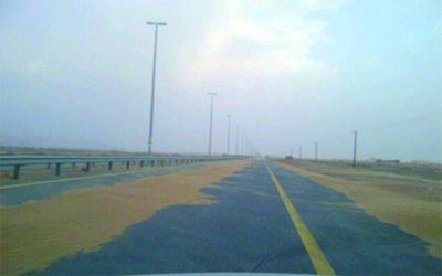 شكا مرتادون لطريق المدام- الشويب تراكم كثبان رملية على أطراف الطريق تعرقل السير وتتسبب في حوادث، مطالبين بلدية المدام بوضع حل لزحف الرمال، خصوصاً عند هبوب الرياح. من جانبه، أكد رئيس بلدية المدام، سالم مياله، أن البلدية تعمل على التصدي لظاهرة الرمال المتحركة على الطريق، إذ يجري تنفيذ مشروع لتشجير أطراف الطريق بأشجار الداماس والراك، مشيراً إلى أنه يتم حاليا زارعة 11 كيلومتراً من الاشجار ضمن المرحلة الاولى من المشروع الذي يتم على ثلاث مراحل.