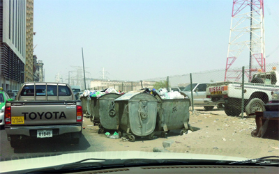حاويات قمامة في منطقة النهدة في الشارقة تشوه المنظر العام، وتعرقل حركة السير، نتيجة امتدادها داخل الشارع، في ظل غياب كامل لعمال البلدية، يرافقه غياب الرقابة على الحاويات.