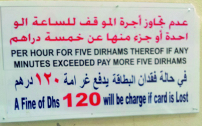 رفعت جهة لوحة إرشادية على مدخل مواقف سوق نايف في منطقة ديرة في دبي، تحتوي على الكثير من الأخطاء اللغوية، إذ كتبت كلمة «الواحدة» على جزئين، إضافة إلى أن العبارة ركيكة وغير مفهومة، لذا يتعين على الجهات المعنية في الإمارة مراجعة هذه اللوحات للتأكد من صياغتها بلغة عربية صحيحة.