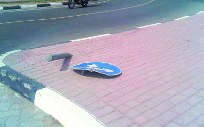 تعرضت لوحة إرشادية بمدينة ديسكفري، في دبي، لحادث صدم منذ أيام عدة، أدى إلى تحطمها.