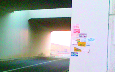 إعلانات وملصقات على جانب جدار نفق، تعكس جفاف الشعور بالانتماء الحضاري إلى هذا المكان، واستخفافاً بما ينجم عن هذا السلوك من تلوث بصري.