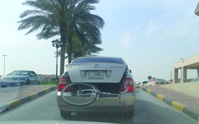 وضع سائق دراجة هوائية في الصندوق الخلفي للمركبة بطريقة بارزة، إذ لم يحكم تثبيتها، وتالياً قد تسقط على الطريق وتتسبب في وقوع حوادث، فضلاً عن أن هذا التصرف متهور وغير حضاري، ولذا يتعين على الجهات المعنية تشديد الرقابة على الطرق، وزيادة الحملات الأمنية لحث السائقين على اتباع قواعد المرور.