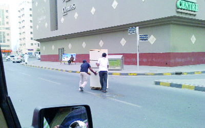 فوجئ مارة في أحد شوارع الشارقة بشخصين يقودان ثلاجة وسط الطريق دون مبالاة بحركة المركبات، الأمر الذي يشكل خطراً على حياتهما وحياة الآخرين، خصوصاً أن سائقي المركبات لا يتوقعون عبور ثلاجة بهذه الطريقة غير الآمنة، لذلك يجب على الجهات المعنية عمل توعية للعمالة غير المتعلمة بضرورة الالتزام بشروط السلامة عند نقل الأثاث، حرصاً على السلامة العامة، وحفاظاً على المظهر الحضاري للدولة.