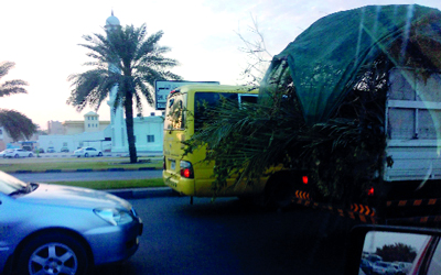 وضع سائق كمية كبيرة من عشب الأشجار في الصندوق الخلفي للمركبة التي يقودها، وهي حمولة زائدة قد تسقط على الطريق وتتسبب في وقوع حوادث، فضلاً عن أن هذا المظهر غير حضاري، ولذا يتعين على الجهات المعنية تشديد الرقابة على الطرق، وتوعية السائقين بقواعد المرور.