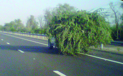وضع سائق حمولة زائدة عبارة عن كمية كبيرة من أغصان الأشجار في الصندوق الخلفي للمركبة التي يقودها، حالت دون رؤيته المركبات القادمة من الخلف، فضلاً عن احتمال سقوطها على الطريق، ومن ثم قد تتسبب في وقوع حوادث مرورية، لذا يجب على الجهات المعنية تشديد الرقابة على الطرق، وتوعية السائقين وحثهم على الالتزام بقوانين المرور.