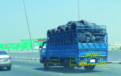 وضع سائق عدداً كبيراً من الإطارات في صندوق المركبة التي يقودها، وتالياً فالحمولة زائدة، إذ قد تسقط الإطارات على الطريق وتتسبب في وقوع حوادث، لذا يتعين على السائقين الحرص على نقل حمولة مناسبة لا تعرضهم للخطر، فضلاً عن تشديد الجهات المعنية حملاتها على الطرق لتوعية قائدي المركبات.