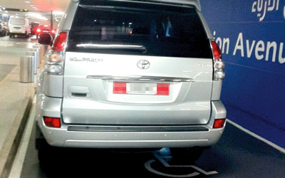 تكررت ظاهرة تعدي سائقي مركبات خاصة على المواقف المخصصة لذوي الإعاقة، خصوصاً في المراكز التجارية، الأمر الذي يحرم هذه الفئة من حقها (الذي حدده القانون) في الوقوف الآمن بجوار المدخل. وكما في الصورة فإن مرتكب هذه المخالفة يقود مركبة تحمل لوحات هيئة دبلوماسية، احتل بها موقفاً للمعاقين، لذا نتمنى على الجهات المعنية تكثيف حملات التوعية بأهمية الحفاظ على حقوق ذوي الإعاقة، وتشديد العقوبة على أي سائق يحرمهم من حق خصصته لهم الدولة.