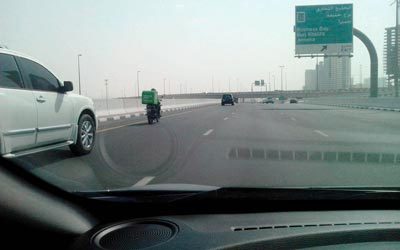 عرّض سائق هذه الدراجة نفسه وآخرين للخطر باختياره المسرب السريع الواقع أقصى يسار الطريق للسير فيه. وهو سلوك يتكرر من كثير من سائقي الدراجات النارية، الذين يزاحمون المركبات التي تسير بسرعات عالية في المسرب الأيمن، غير مكترثين بفعلتهم، وحبذا لو أرشدت الشركات والمطاعم التي تستخدم الدراجات النارية السائقين لديها بضرورة التقيد بقوانين السير حفاظاً على أرواحهم.