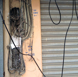 أسلاك كهربائية تتدلى من جدران محل تجاري في منطقة ديرة، بالقرب من المكتبة العامة، من دون حماية، ما يشكل إنذارا مستمرا باحتمال نشوب حريق، في حال وقوع ماس كهربائي، وليست هذه ظاهرة فريدة من نوعها، فهي تتكرر في كثير من البنايات السكنية الموجودة بالمنطقة، الأمر الذي يستدعي إجراء حملات تفتيش عاجلة.