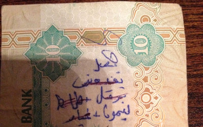 تظهر الصورة كتابة شخص قائمة مشترياته على ظهر العملة الورقية للدولة، دون أدنى مراعاة لقيمتها المعنوية، وهذه ظاهرة غريبة، وسلوك غير حضاري، قد يستدعي إصدار قانون يحافظ على العملة من الكتابة عليها.