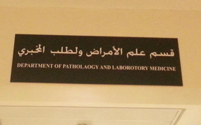 لافتة على باب قسم في أحد المستشفيات الخاصة بدبي، كتب عليها «قسم علم الأمراض ولطلب المخبري»، بدلاً من كتابة «الطب المخبري». وهو نوع من الأخطاء يتكرر في كثير من المرافق والمنشآت الخاصة، على الرغم مما ينطوي عليه ذلك من «إهانة ثقافية» للغة الرسمية في الدولة.